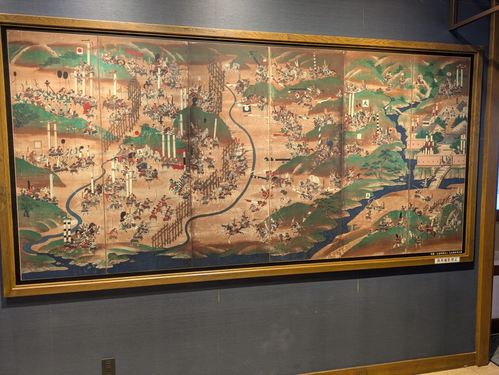 Inside the restaurant, There was a famous and impressive battle illustration of the Battle of Nagashino on the wall. We enjoyed looking at it, and trying to find famous warlords in the illustration.